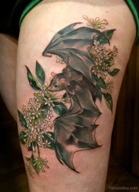 Bat Thigh Tattoo. A bat and honeysuckle thigh design can be a colorful, fragrant symbol of. While many see bat tattoos as a sign of fear, contrary to popular belief, bat.