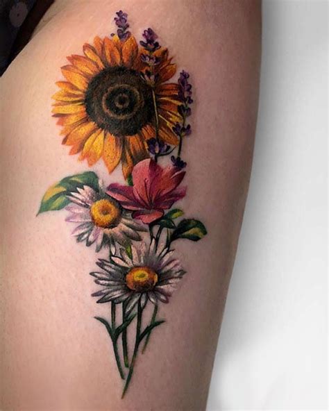 Web sunflower and daisy tattoo most of the time, different flowers go well with each other when it comes to tattoos.